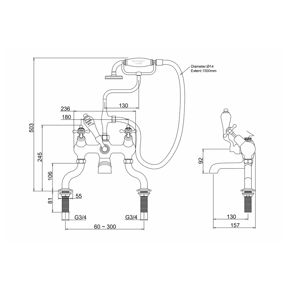 Consists of 1 x Angled bath shower mixer (Including the standard cradle, āSā adjuster, Claremont, Anglesey & Birkenhead divertor handle, hose, ceramic telephone handset , excluding tap heads, base and unions) (T9), 1 x Deck mounting unions (for Bath Shower Mixer & Bath Filler, 3/4) (T18) and 1 x Claremont tap handles (pair) (T1)