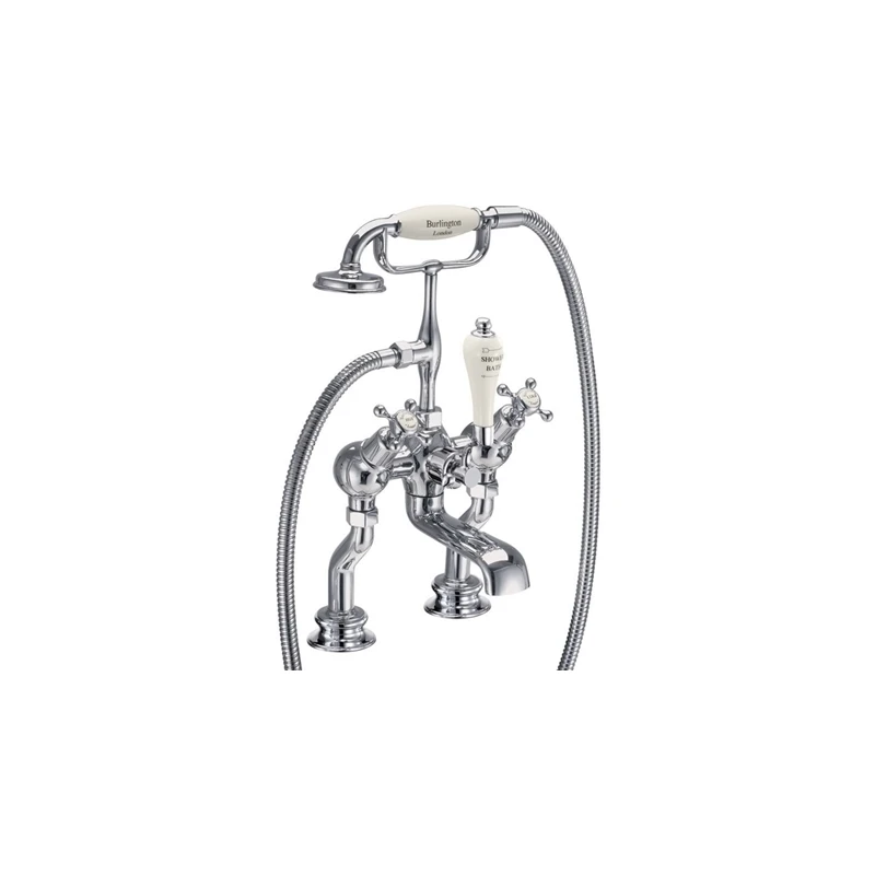 Consists of 1 x Angled bath shower mixer (Including the standard cradle, āSā adjuster, Claremont, Anglesey & Birkenhead divertor handle, hose, ceramic telephone handset , excluding tap heads, base and unions) (T9), 1 x Regent large pair of tap bases (for bath taps, bath shower mixers & bath fillers ā pair) (T4A), 1 x Deck mounting unions (for Bath Shower Mixer & Bath Filler, 3/4) (T18), 1 x Claremont tap handles (pair) ā chrome & medici (T1 MED), 1 x Medici shower handset (ME11-1) and 1 x Medici diverter handle of BSM (ME10)