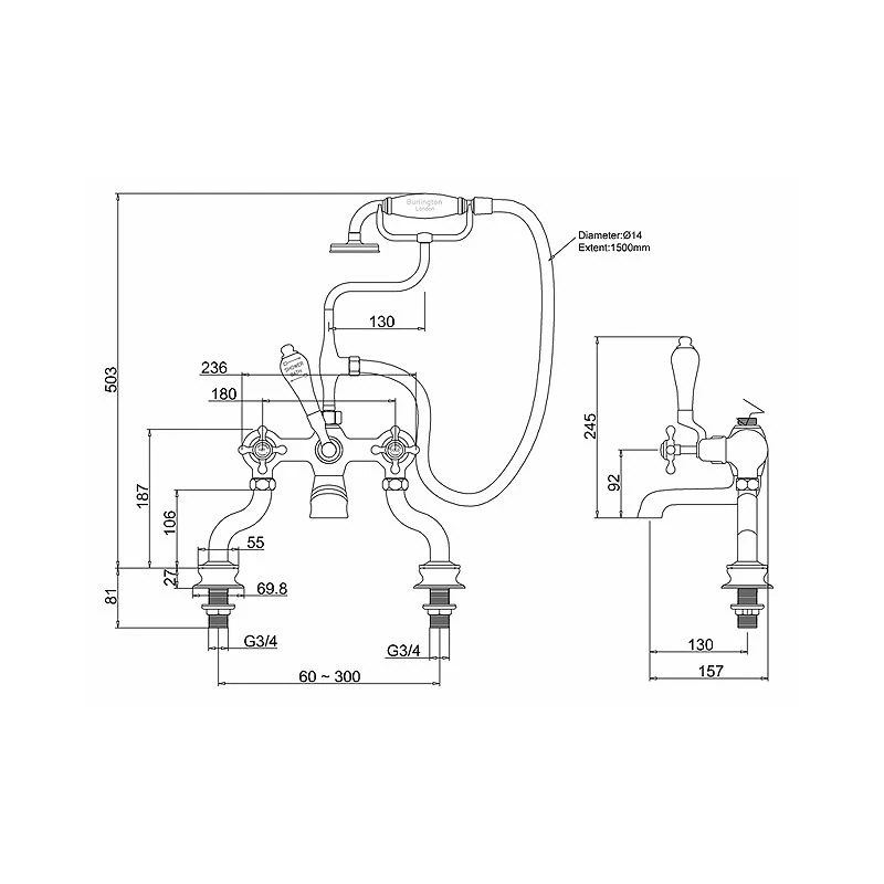 Consists of 1 x Quarter Turn Bath Shower Mixer (Including the standard cradle, āSā adjuster, ceramic diverter, hose, ceramic telephone handset, excluding tap heads, bases and unions) Gold (T8-QT GOLD), 1 x Regent large pair of tap bases (for Bath Taps, Bath shower mixers & Bath fillers ā pair) Gold (T4A GOLD), 1 x Deck mounting unions (for Bath Shower Mixer & Bath Filler, 3/4ā³,pair) Gold (T18 GOLD) and 1 x Claremont tap handles (pair) Gold (T1 GOLD)