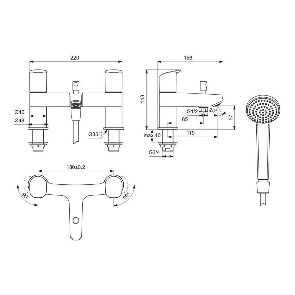 Ceraflex 2 tap hole bath shower mixer, dual control