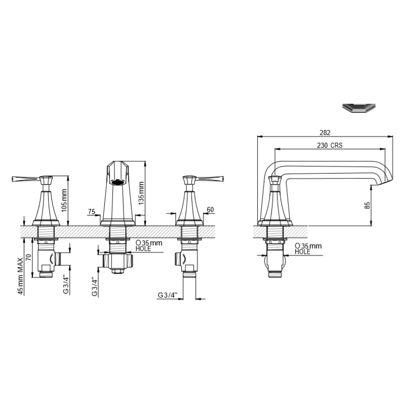 Deco Three-Hole Deck-Mounted Bath Filler with Lever Handles