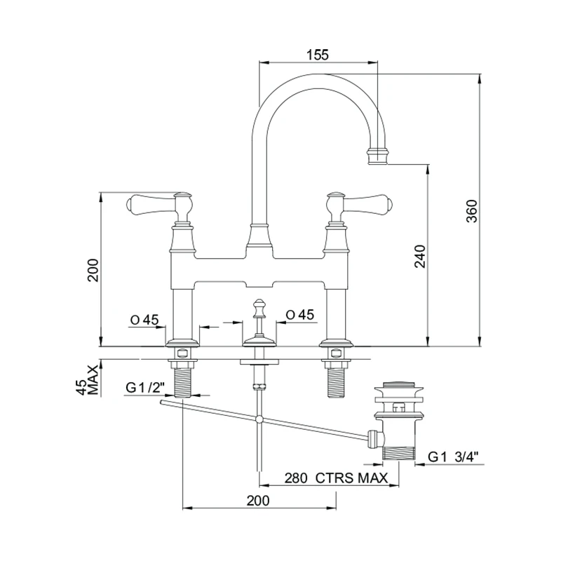 Georgian 3 Hole Deck Mounted Bridge Mixer Tap with Pop-Up Waste and Lever Handles, Chrome