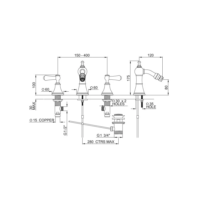 Georgian 3 Hole Bidet Mixer Tap with Lever Handles