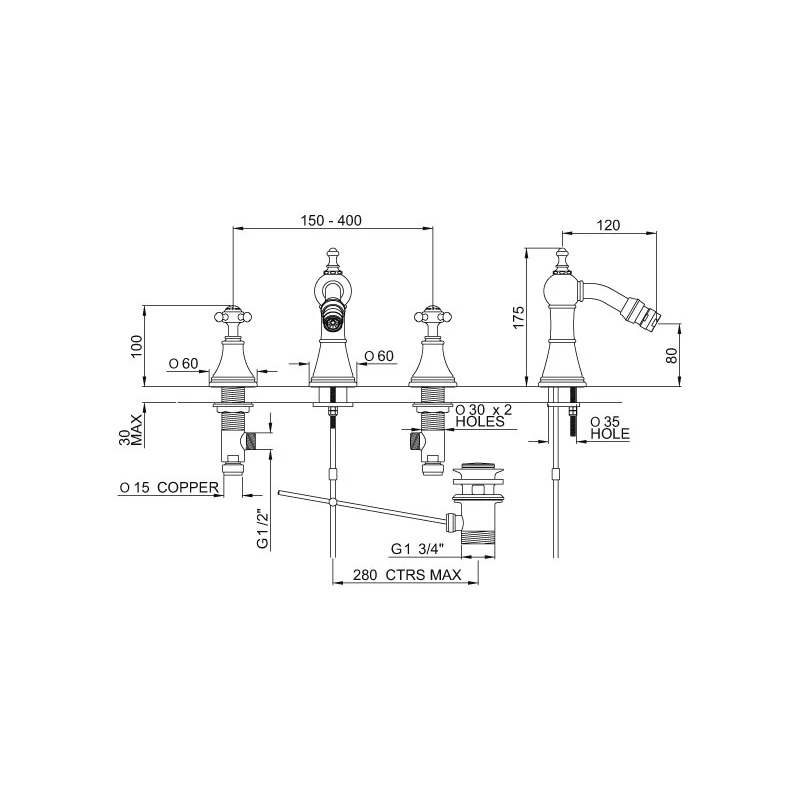 Georgian 3 Hole Bidet Mixer Tap with Crosshead Handles
