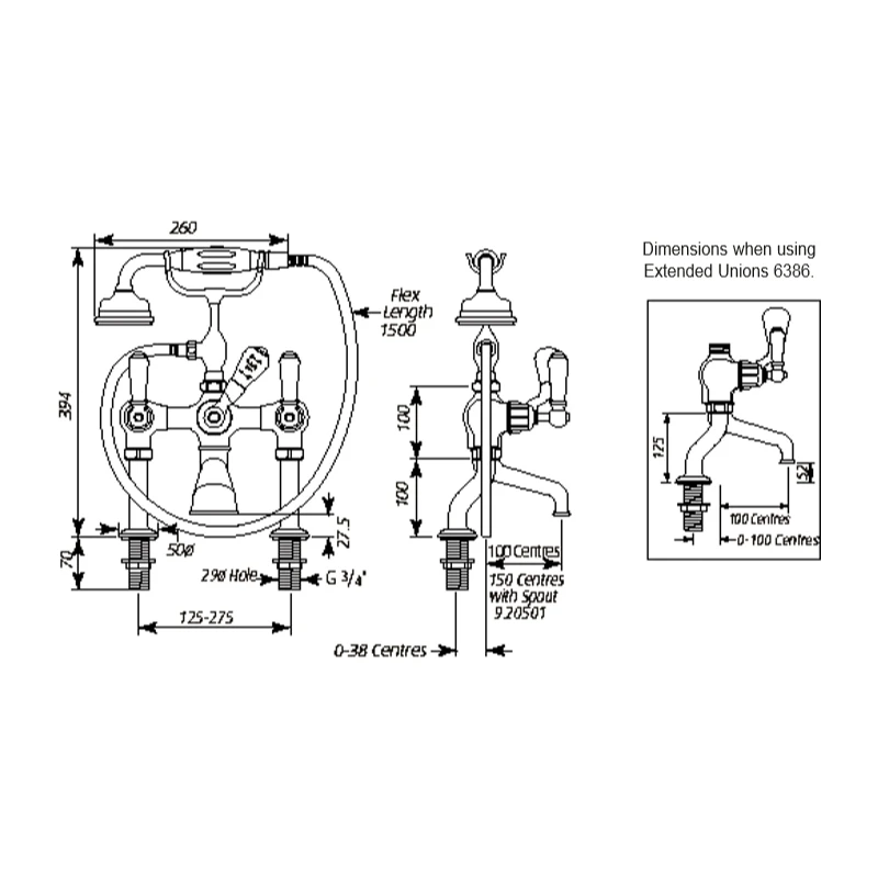 Traditional Bath Shower Mixer Tap and Pillar Unions with Lever Handles, Chrome