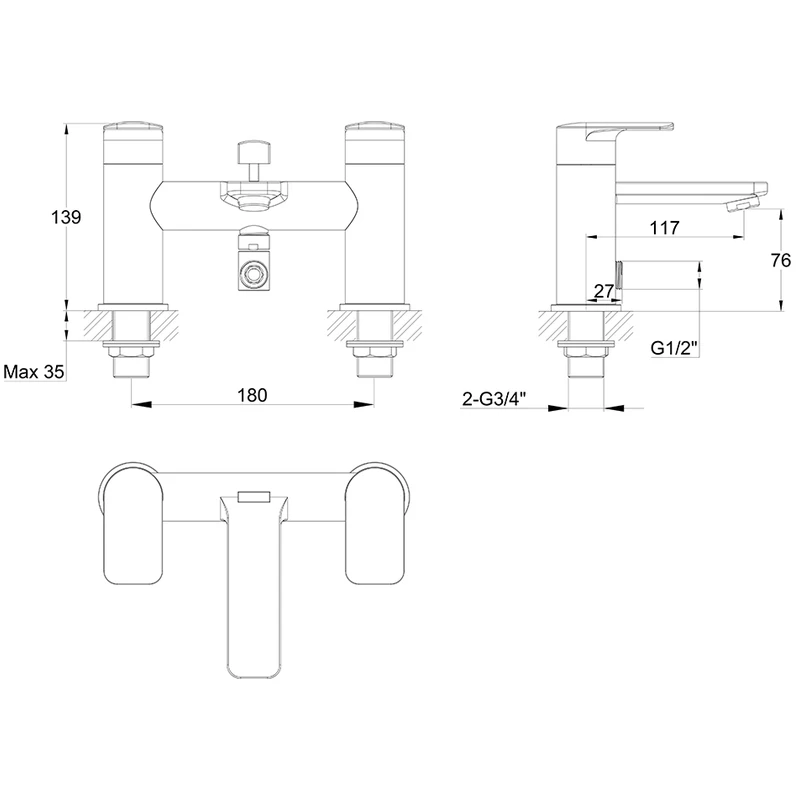 Vitra Solid S 2 Tap Hole Deck Mounted Bath Mixer With Handshower